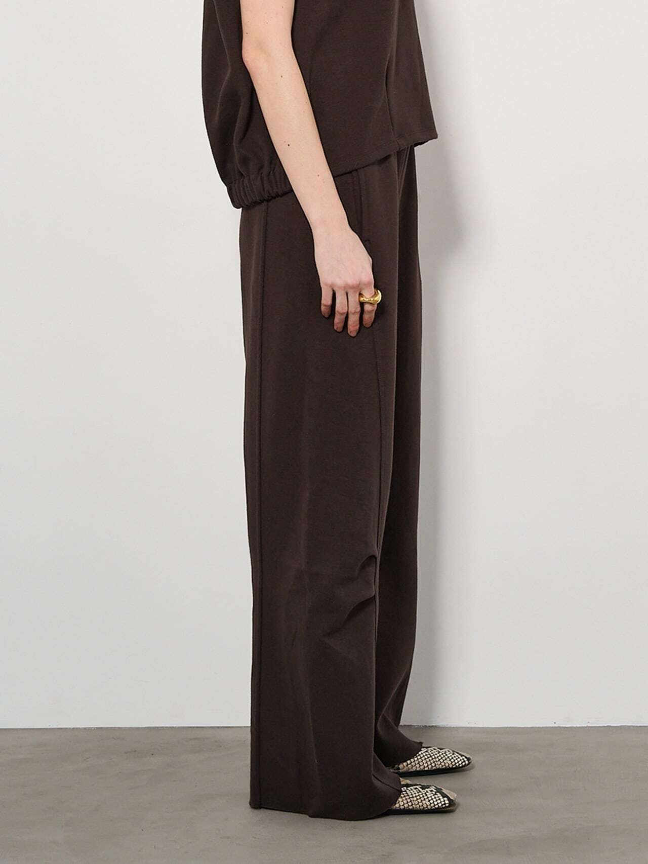 綿ポリエステルのほどよいカジュアル感のあるダブルジャージー素材は裏毛ほどカジュアルすぎない裏側もスムースな肌あたりでパジャマっぽくならない大人におすすめのスウェットパンツです。