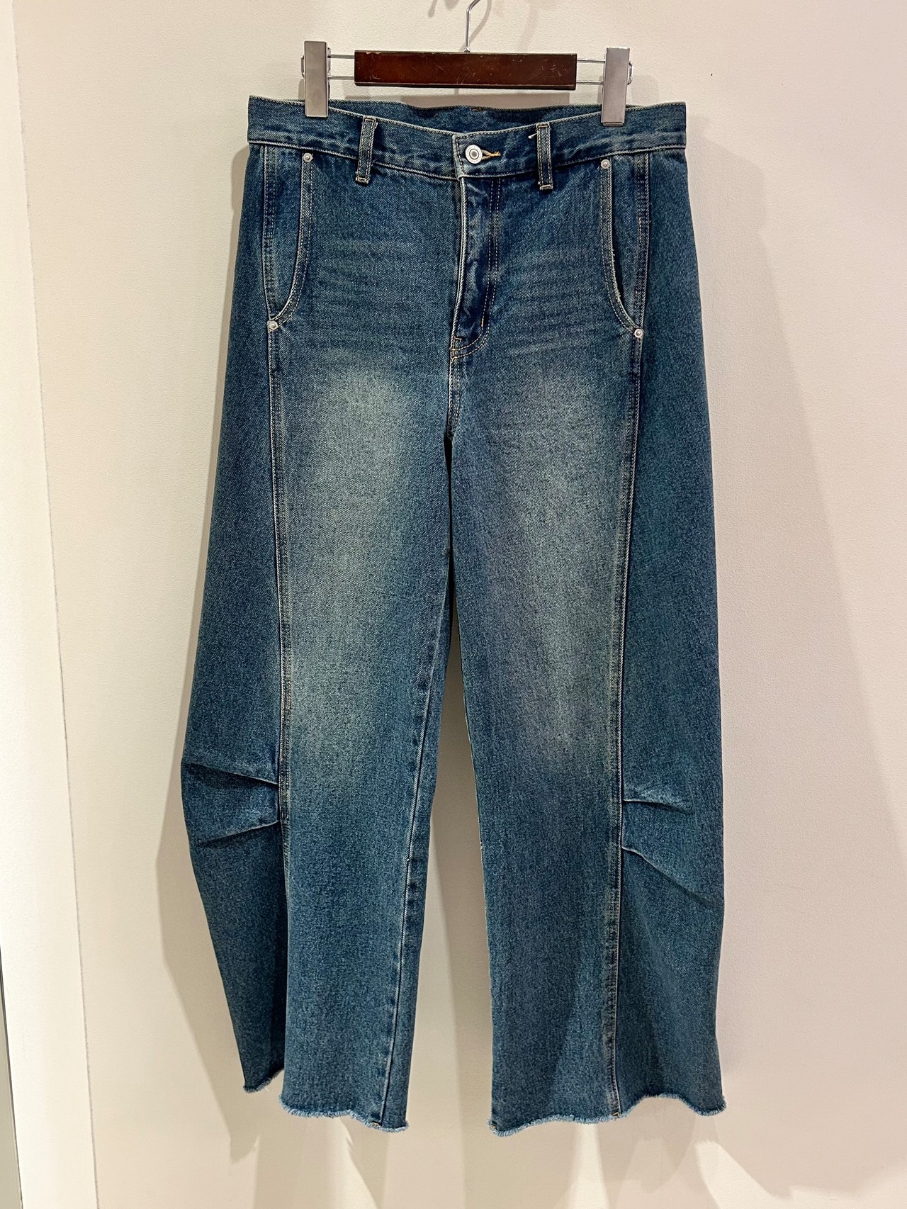 膝に入れたタックで作るユニークなシルエットが特徴のデニムパンツです。