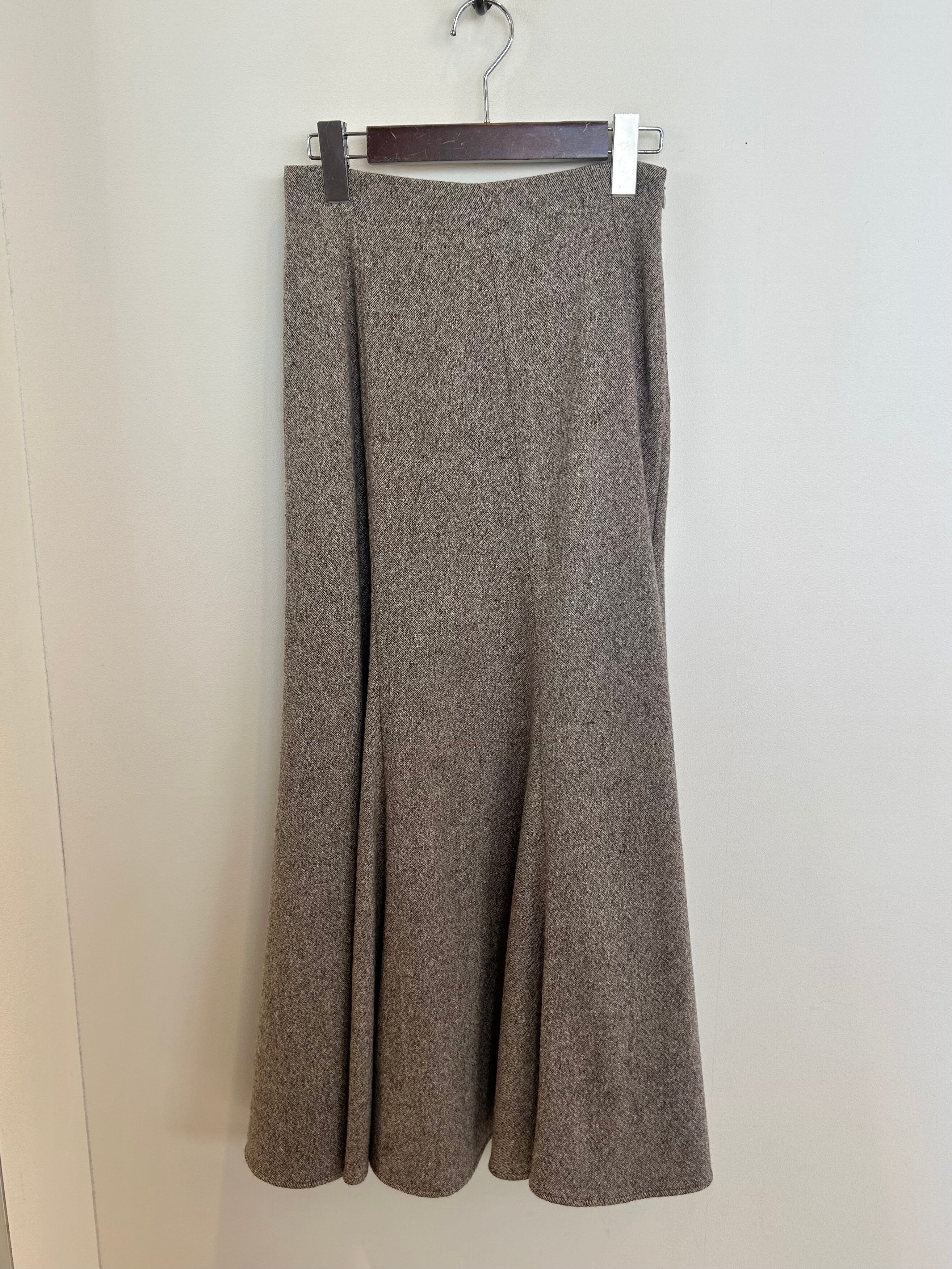秋冬らしい温かみのある生地のセレクトにこだわってお作りしたナロースカートは女性らしさを高めてくれる一枚です。フレア展開の位置を斜めに設定した、大人気のエスカルゴ切り替えで、アシンメトリーなバランスに仕上がりました。ヒップ下からふわっと広がるナローシルエットが、大人の華やぎをプラスします。