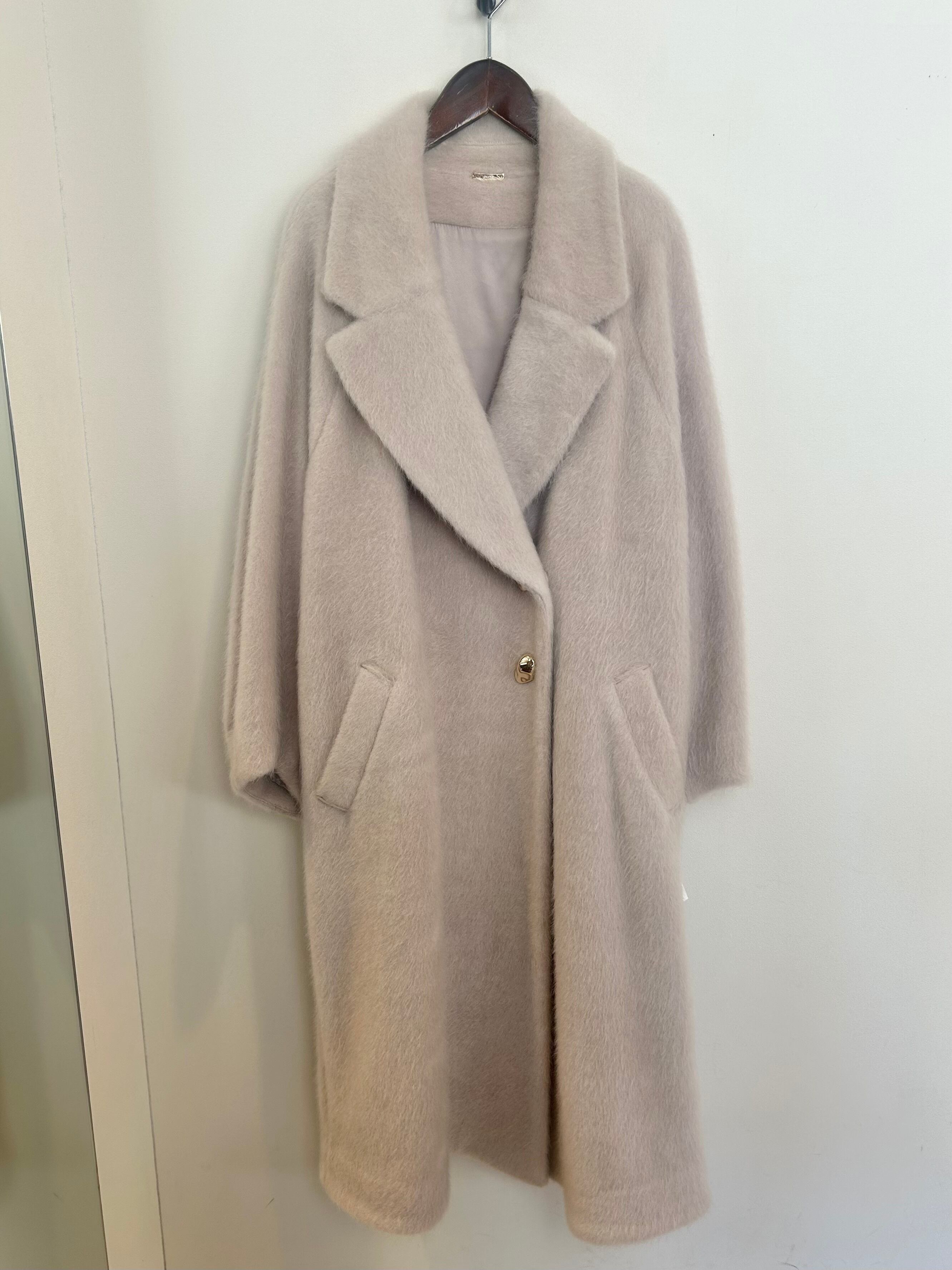 コートのボリューム感で、細見え効果も抜群です。袖は丸みを出して、女性らしい印象に仕上がりました。