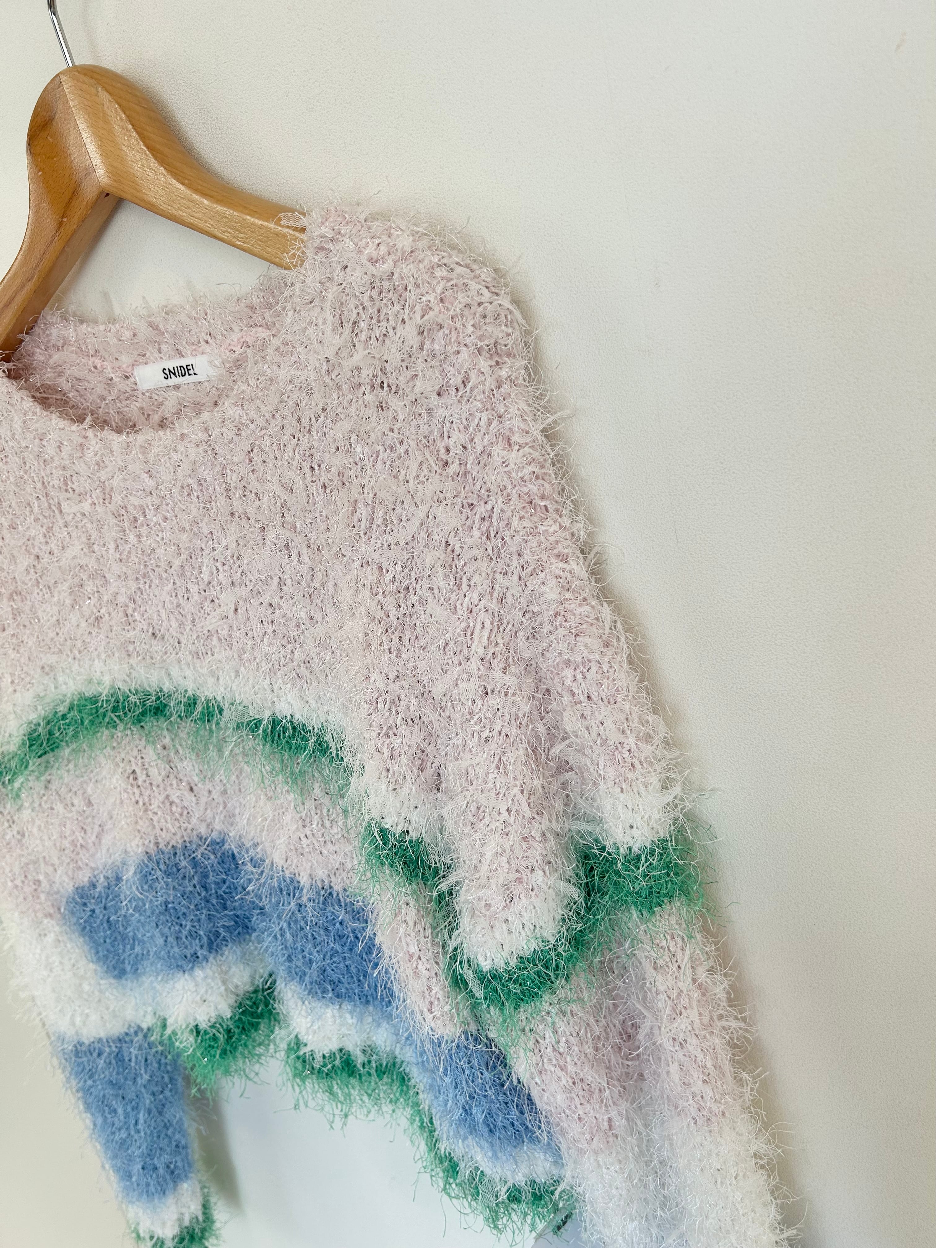 ラメ糸やフェザー、チュールをMIXしたファンシーヤーンのニットプルオーバーは、存在感抜群。サラッと着るだけで上半身を印象的に見せてくれます。素材にインパクトがあるので、形は極力シンプルに。やや短いショート丈で、すっきり着こなせるバランスに仕上げました。長めの袖は、手元でくしゅっとさせてニュアンスたっぷりに。