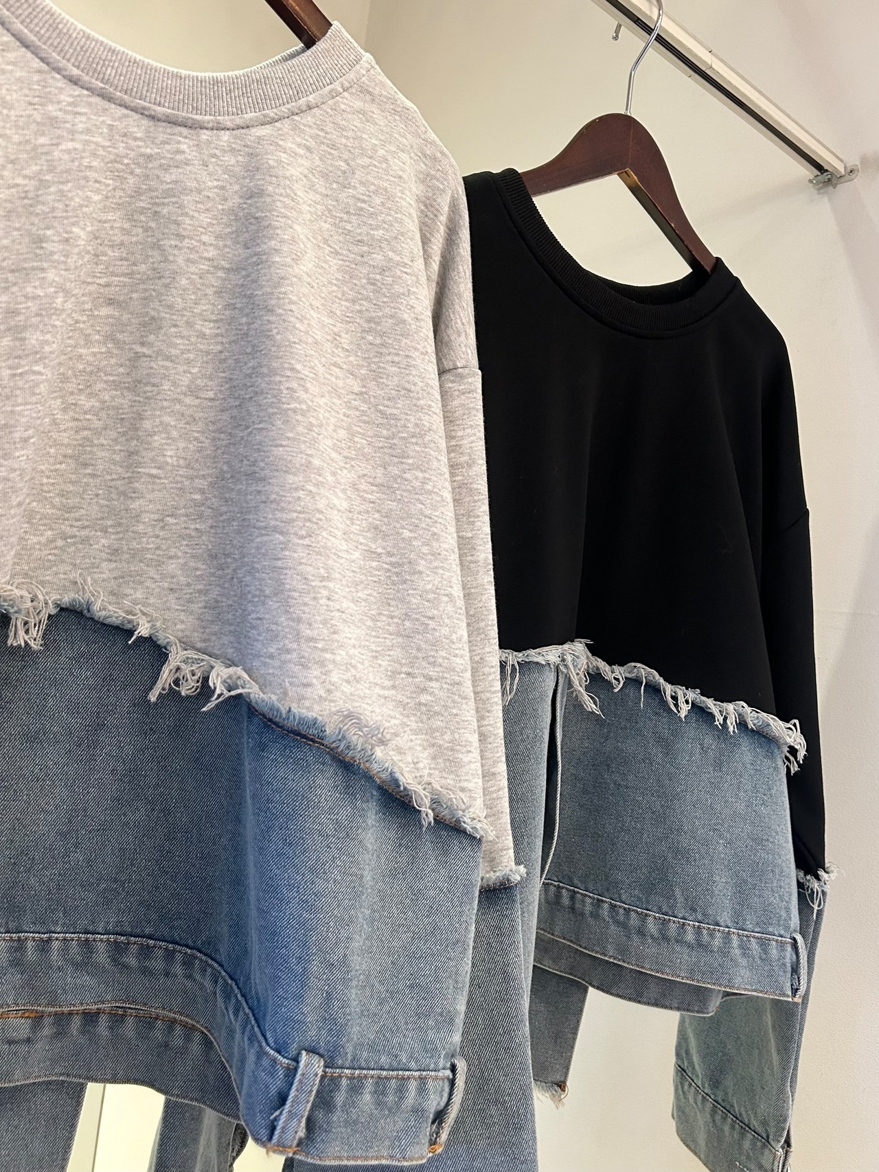 デニム素材とスウェット素材を組み合わせた異素材ドッキングプルオーバー。