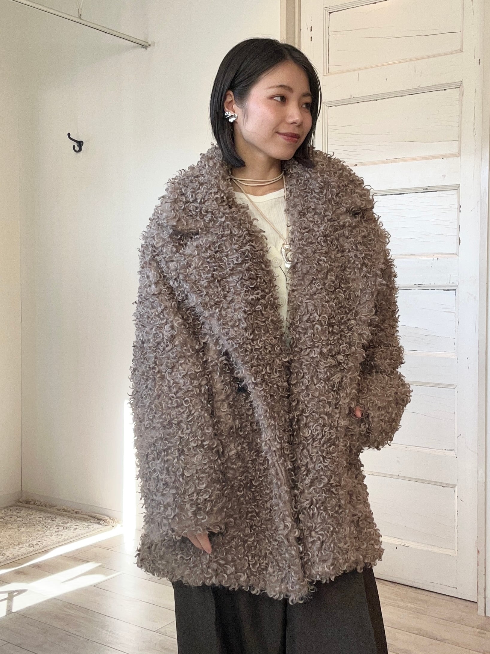 肌触り柔らかく、ふんわりとしたプードルファー素材が魅力のダブルコート!!