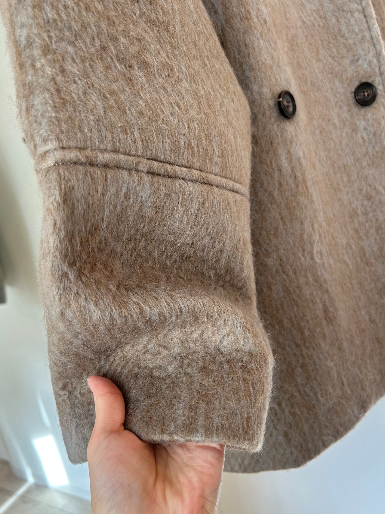 肌触りの良いフェザーのような毛足のある生地感で、ほど良い丈感でお尻まわりまでカバーしてくれる嬉しいサイズ感。