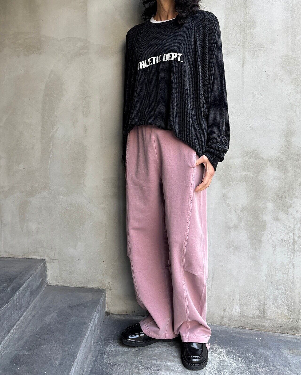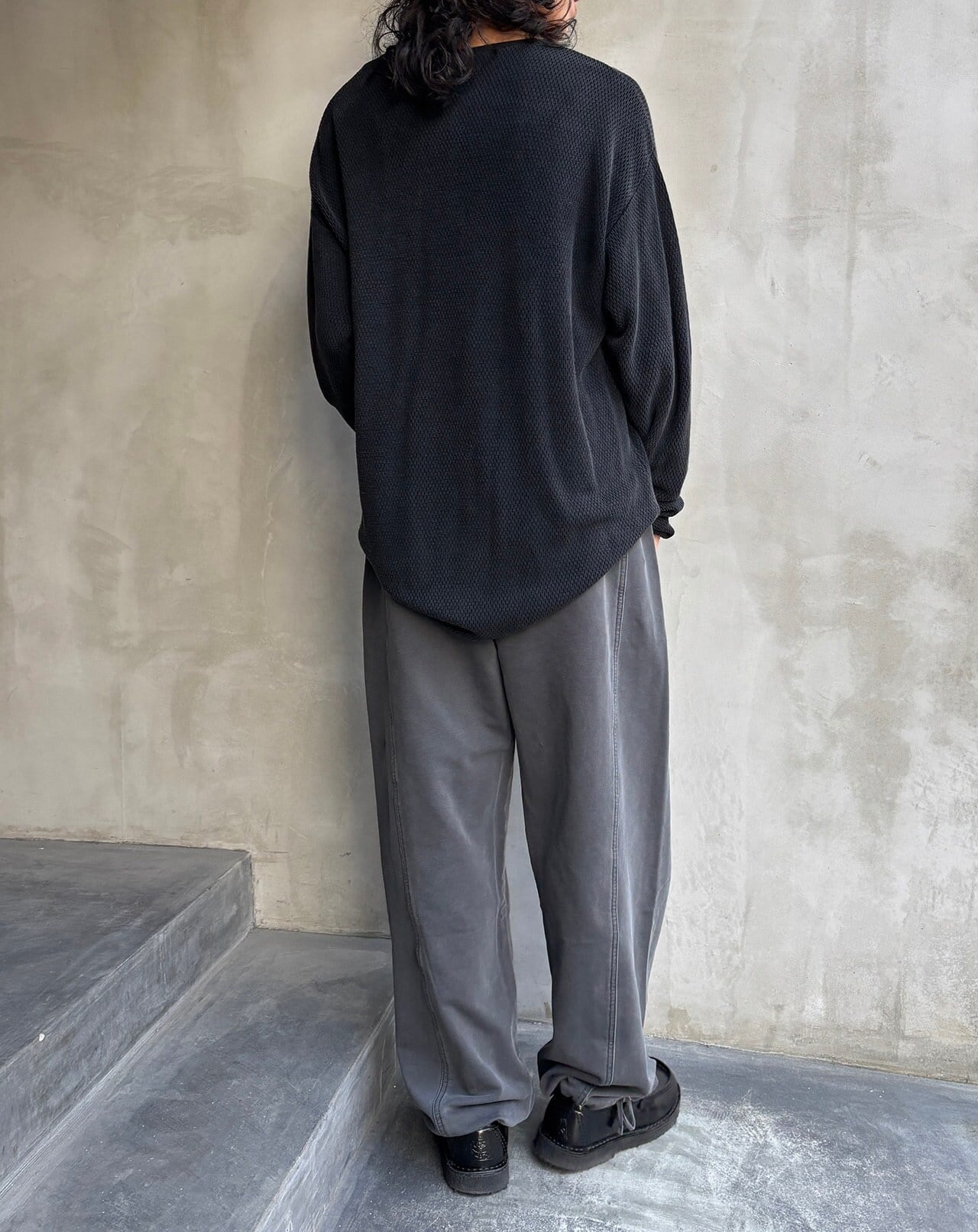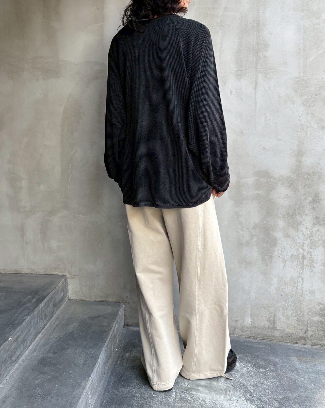 緩やかなカーブの裏毛バレルパンツ。幅広いコーディネートを楽しんでいただく為に、あまりカーブを強調せずにセンターにラインを入れる事で足を綺麗に見せるデザインしています。