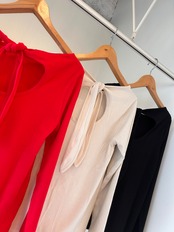 フロントはスクエアネックのすっきりとしたデザインで、上品な印象に。