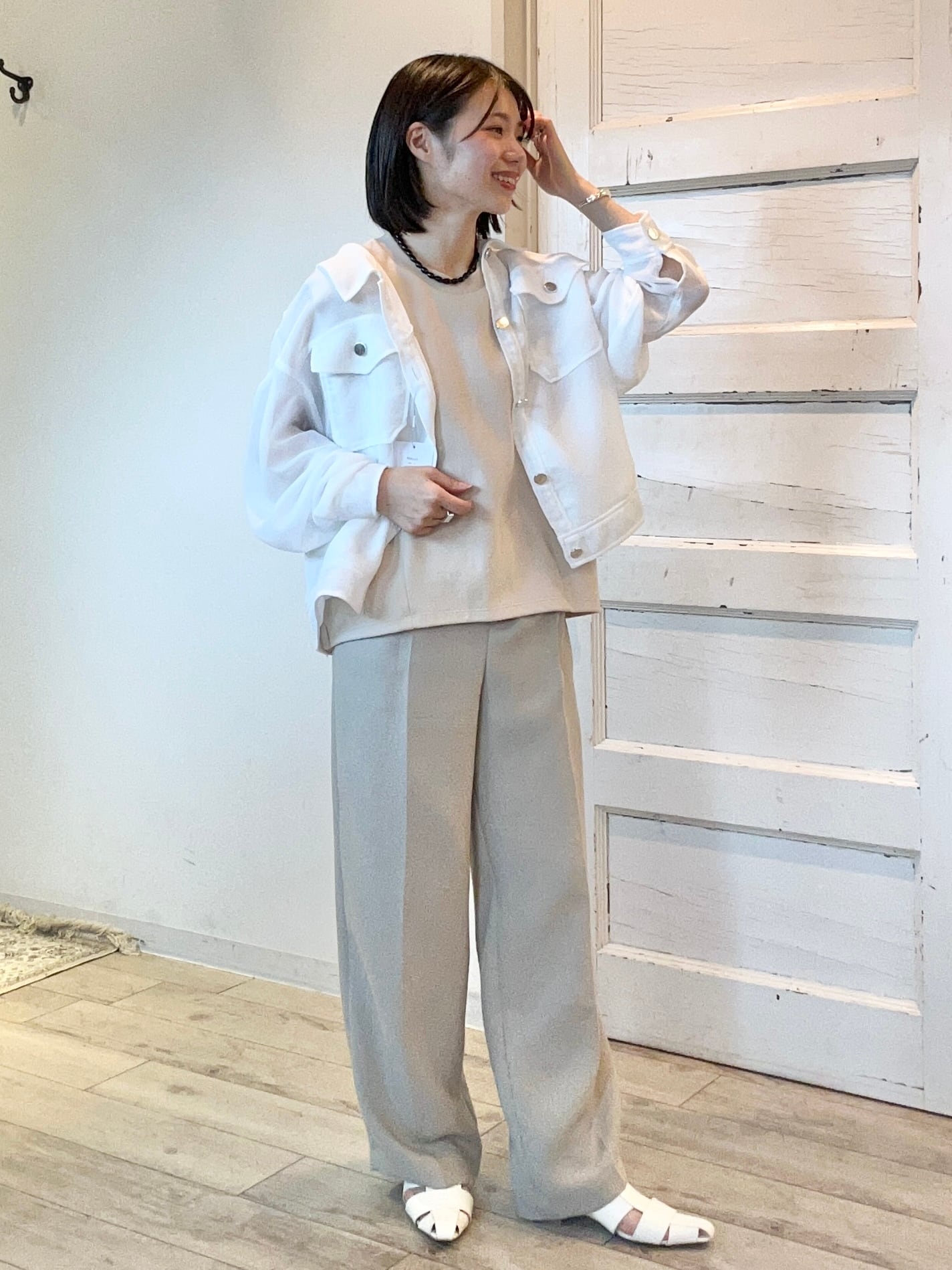 同素材のキャミビスチェとセットアップで着こなせば、統一感のある大人の上級スタイルに。