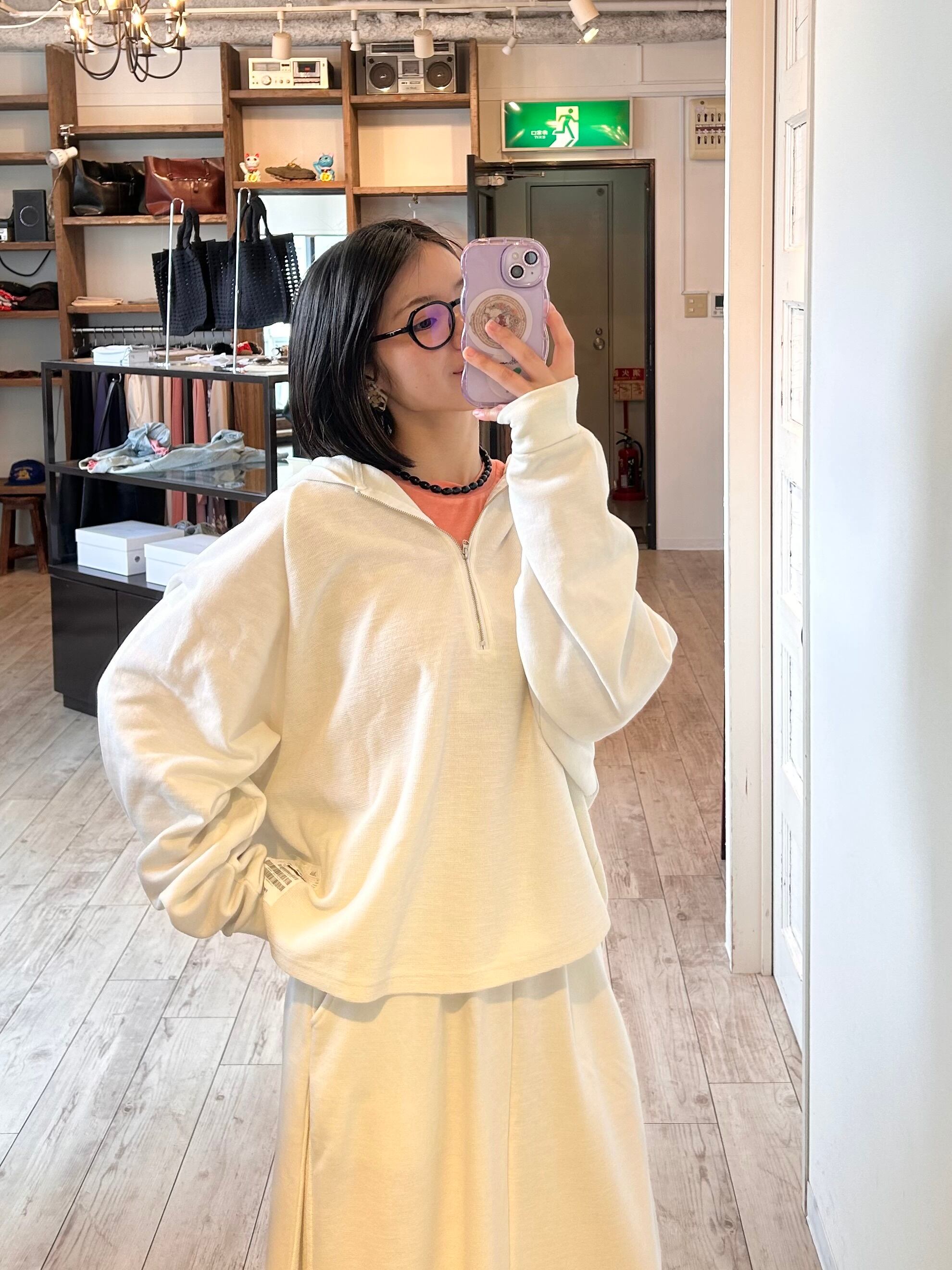 春らしい素材のスラブのハーフジップパーカーです。スウェットよりやや薄い素材ですので長いシーズン着ていただけます。前の裾にブランドパッチを付け、フードにロゴをプリントしています。ジップを少し開けて軽やかなスタイルがおすすめです。カラーはオフ、ライトイエロー、スモーキーピンク、チャコールの4色になります。