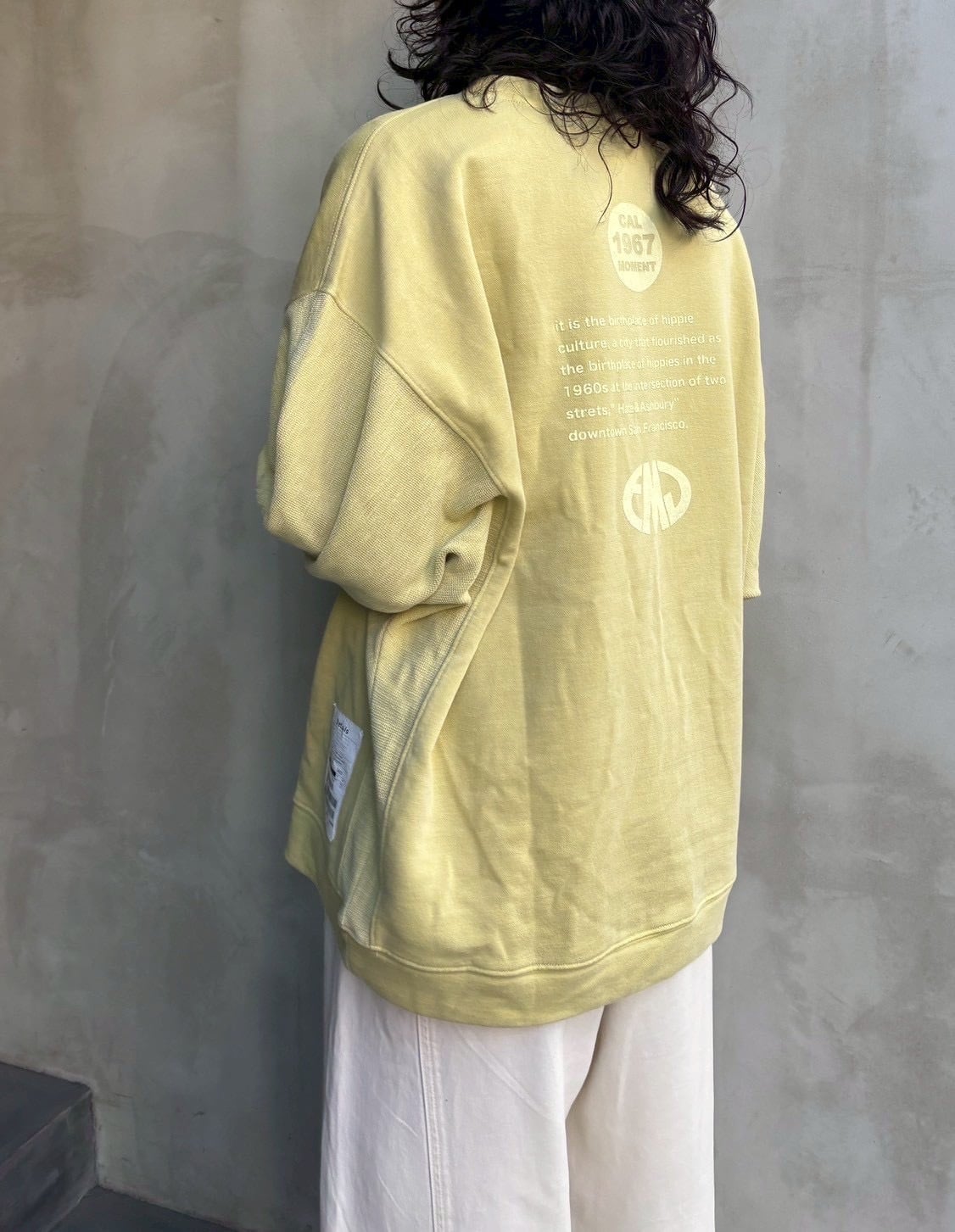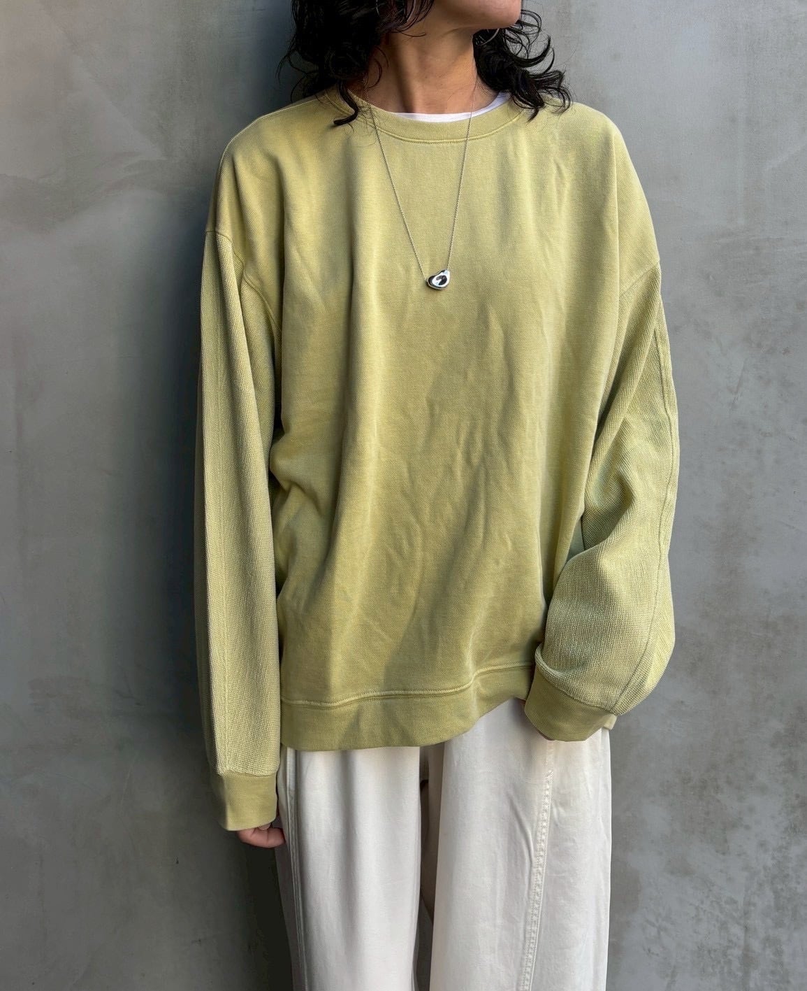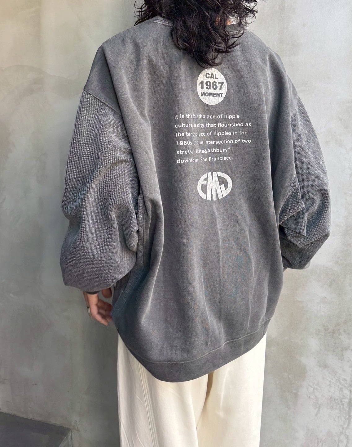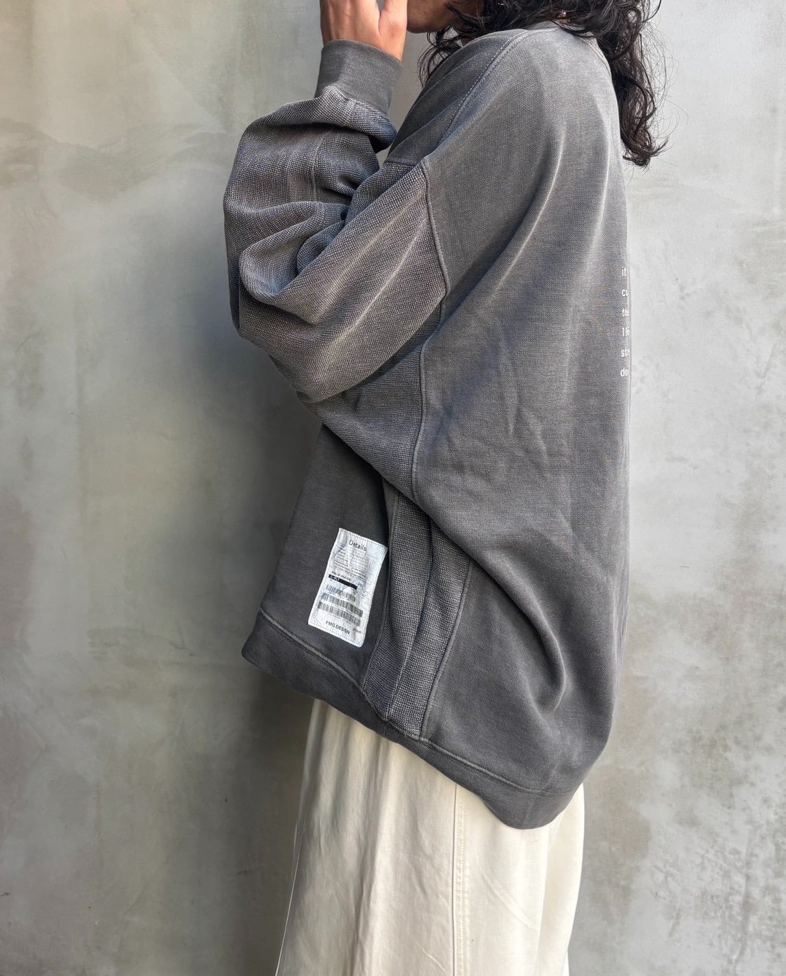 異素材で表情を変えたデザインのドルマンスリーブ型のロンTです。スウェットよりやや薄い素材ですので長いシーズン着ていただけます。前の裾にブランドパッチを付け、縦に並んだバックプリントも大人の女性にオススメです。