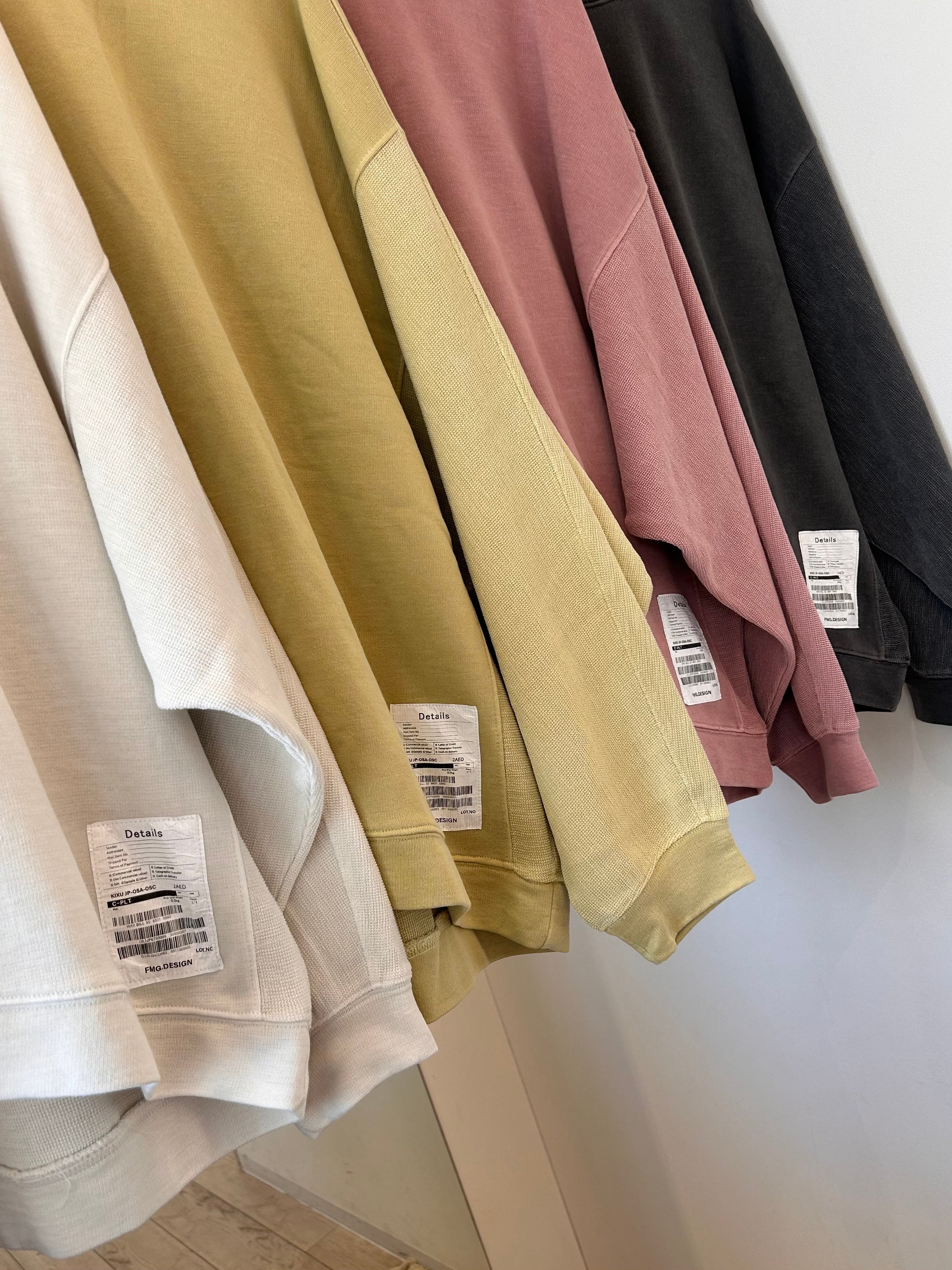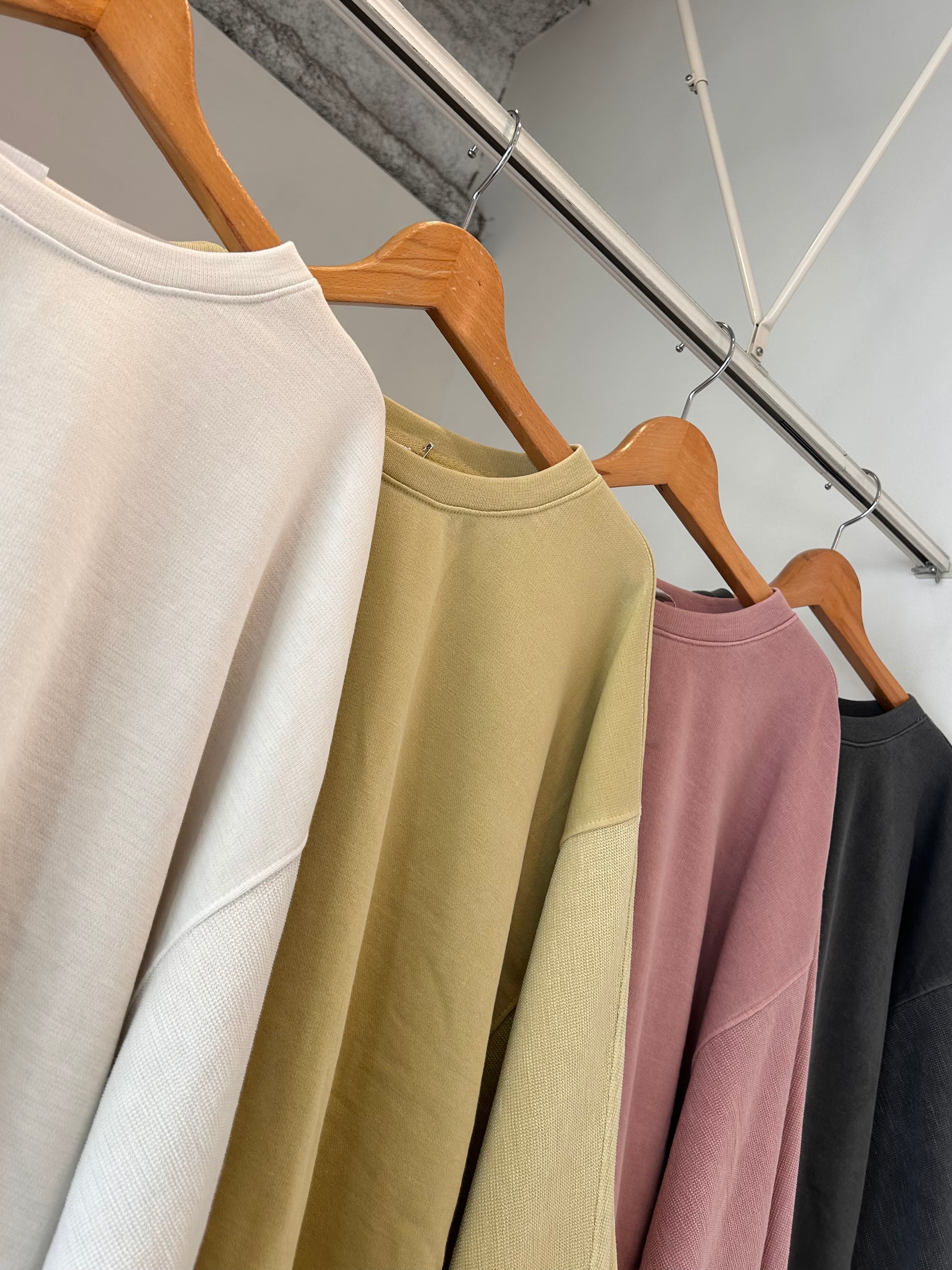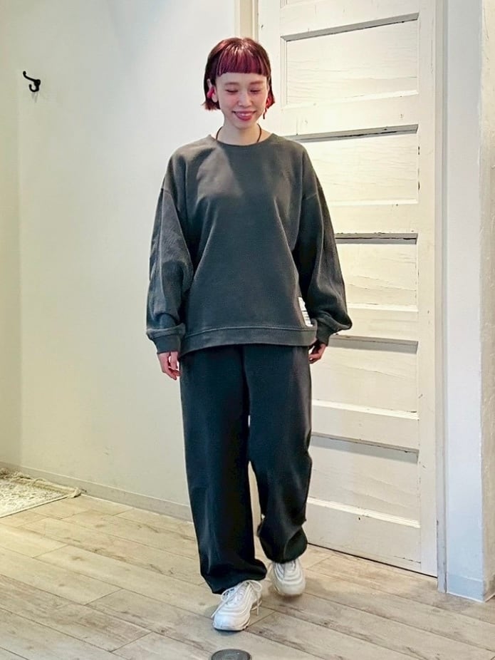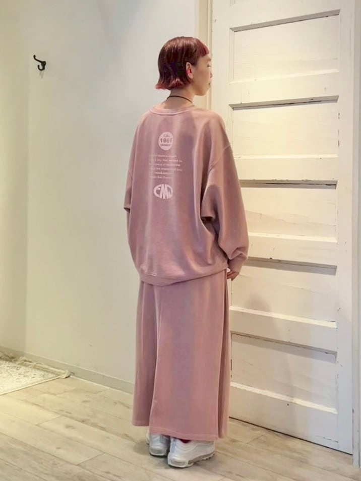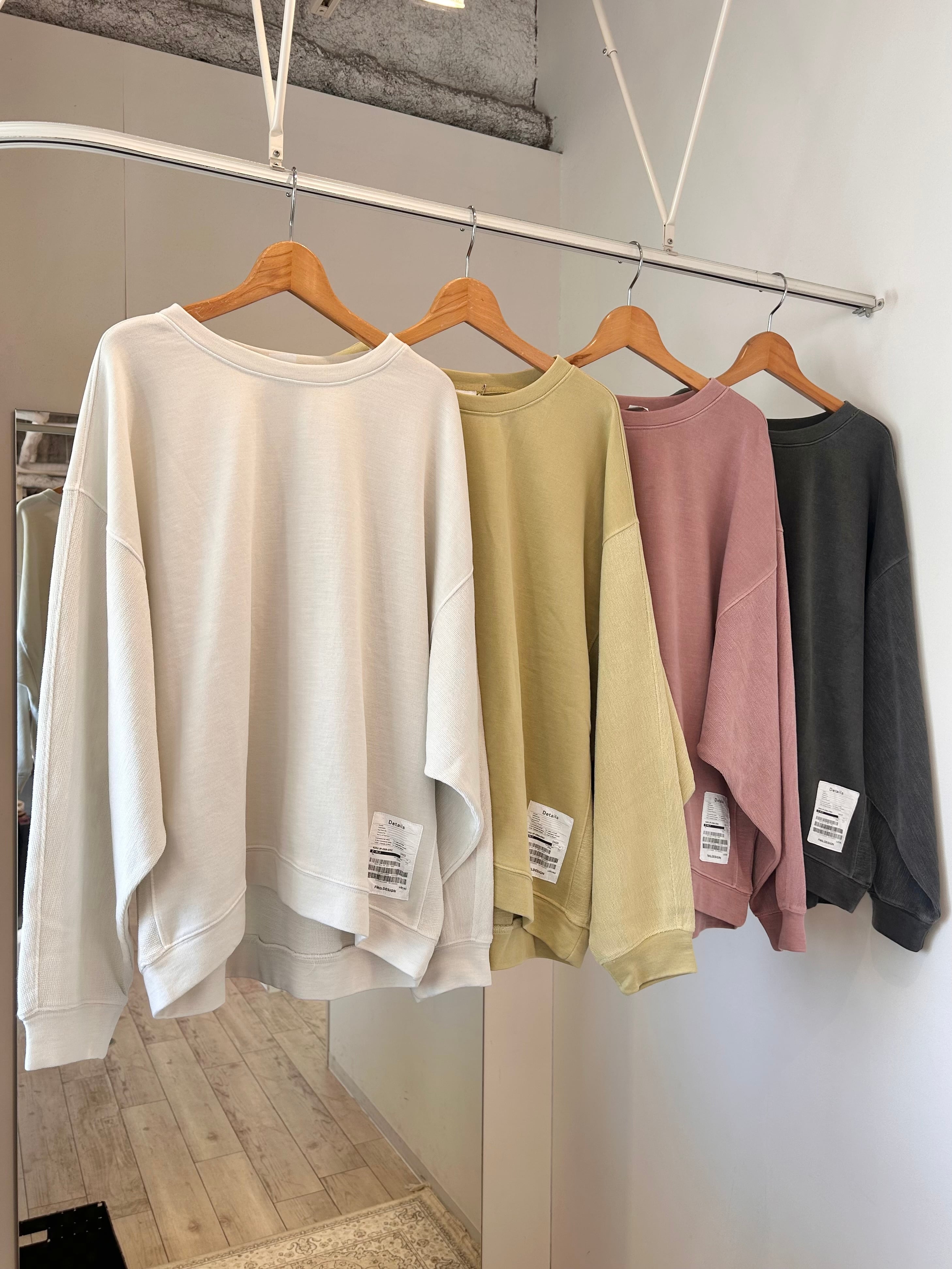 異素材で表情を変えたデザインのドルマンスリーブ型のロンTです。スウェットよりやや薄い素材ですので長いシーズン着ていただけます。前の裾にブランドパッチを付け、縦に並んだバックプリントも大人の女性にオススメです。