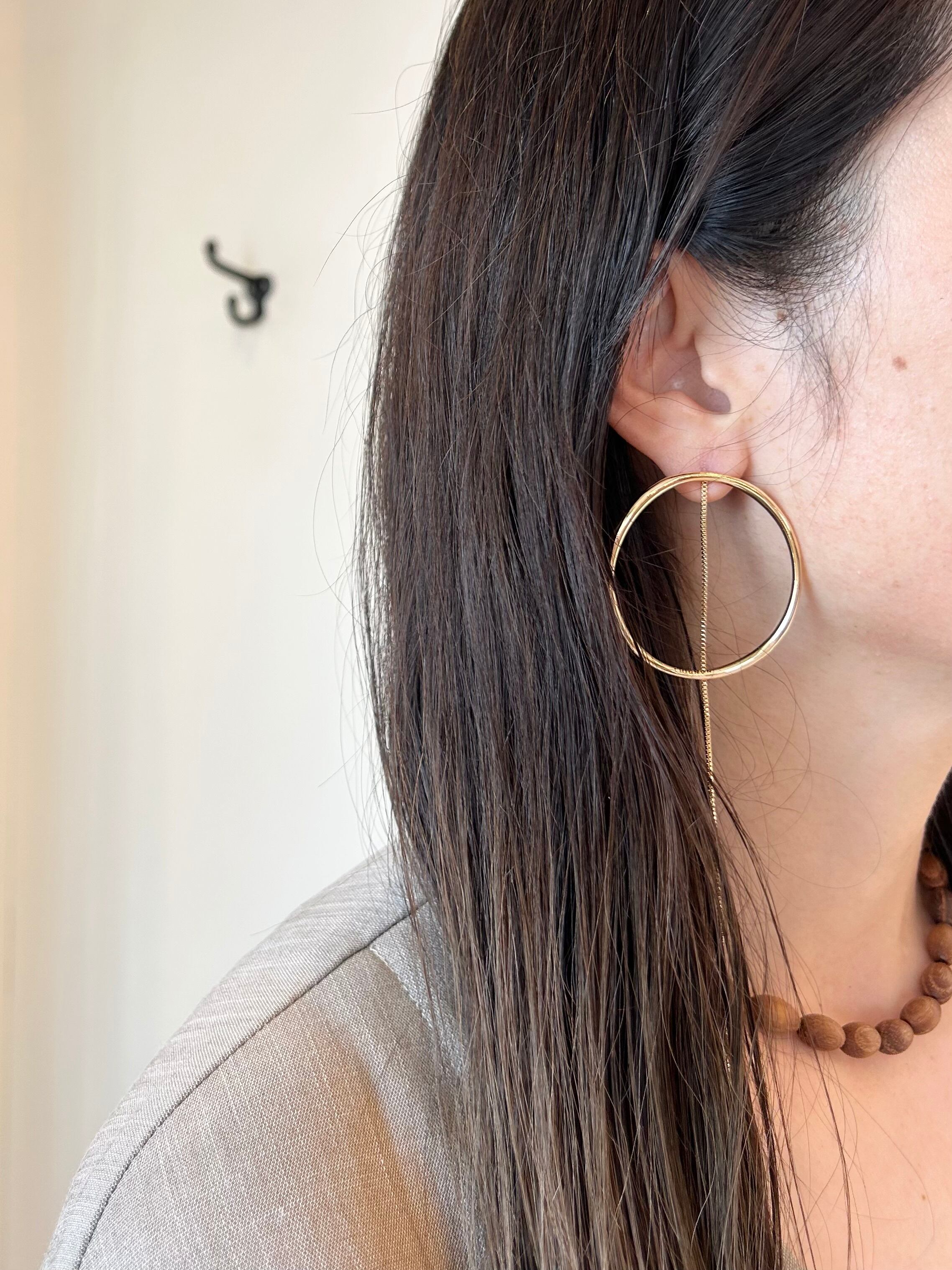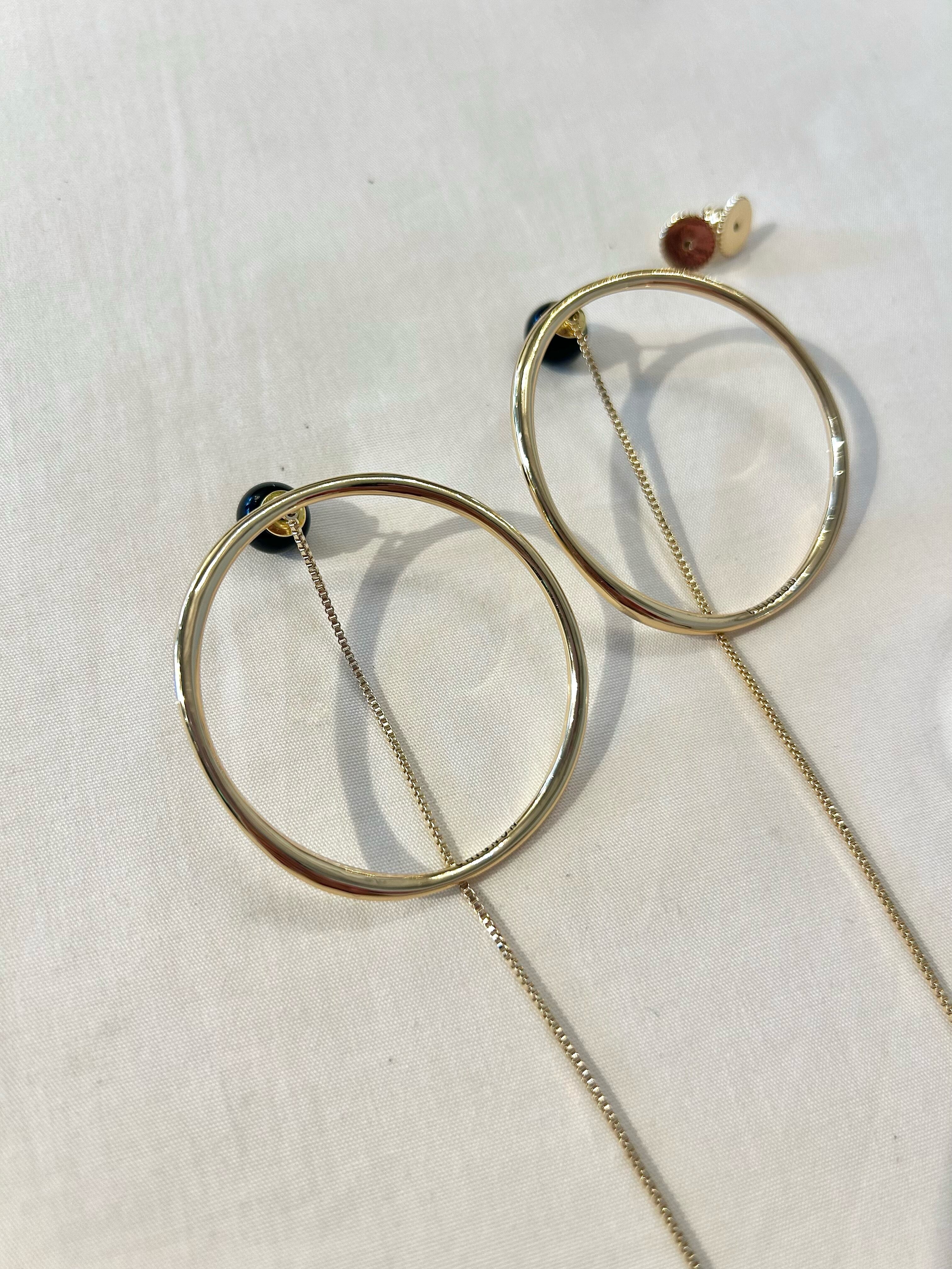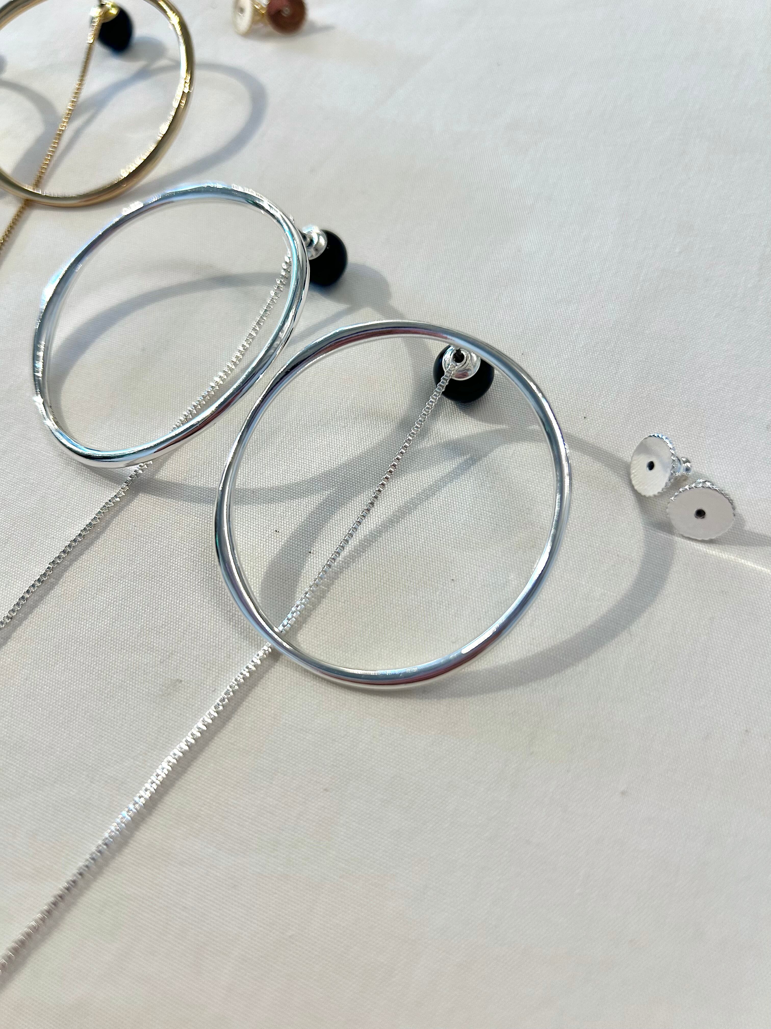 滑らかで抑揚感のある線で仕上げた丸フープピアスは今回輪っか部分を前にしたデザインに仕上げております。強弱のある線形と湾曲したフープにきらっと揺れるチェーン&オニキスキャッチ組み合わせは、凛とした力強い女性らしさもありつつ、軽やかに動きのあるデザインとなっております。