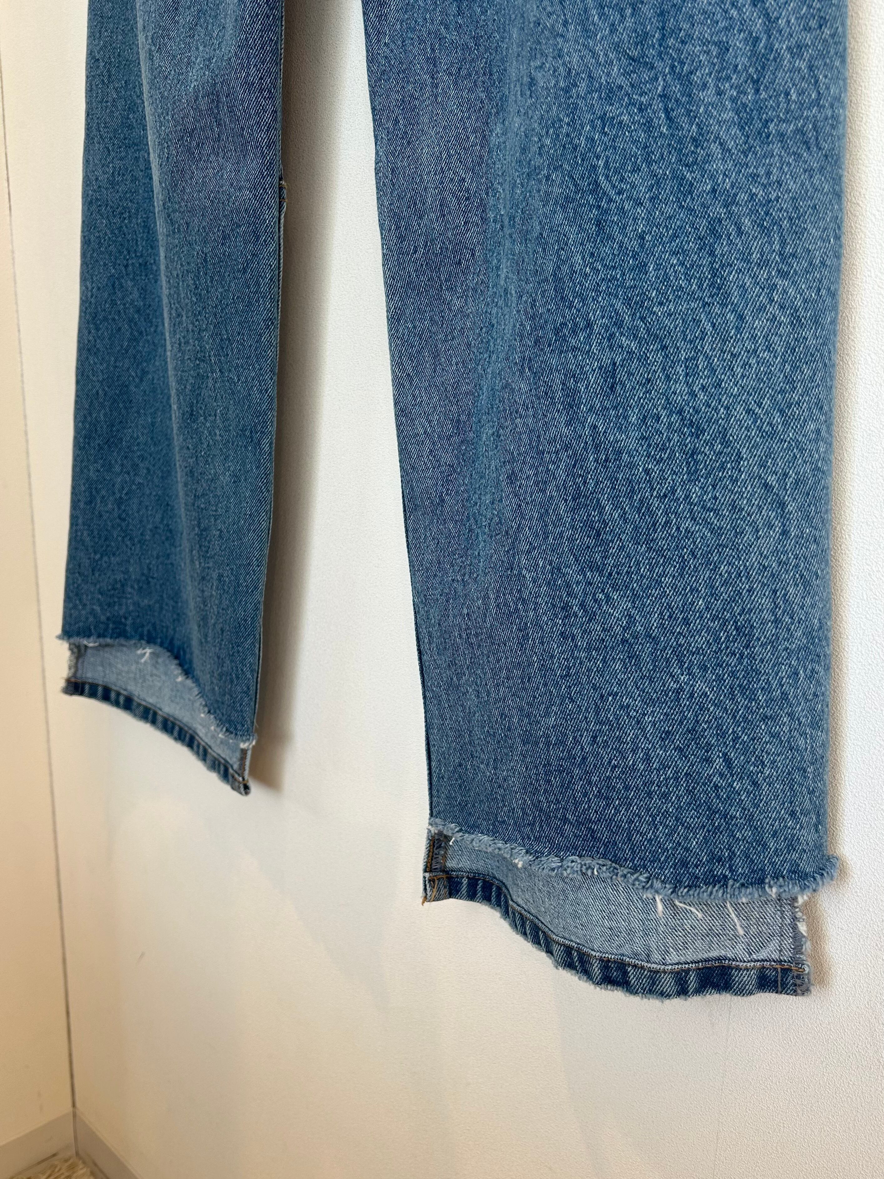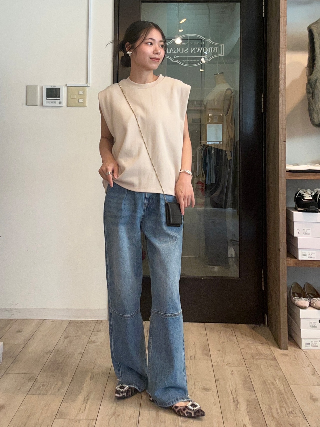 膝下にいれた切り替えデザインや、ところどことに施したさりげないダメージ加工など、こだわりのつまった1枚です。